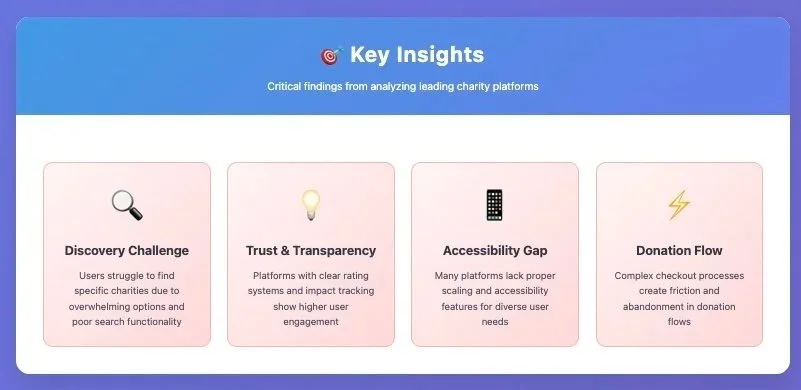 We conducted a competitive analysis to understand other popular charity platforms. From this, we gained insight on what features to highlight on the website and our target audience.